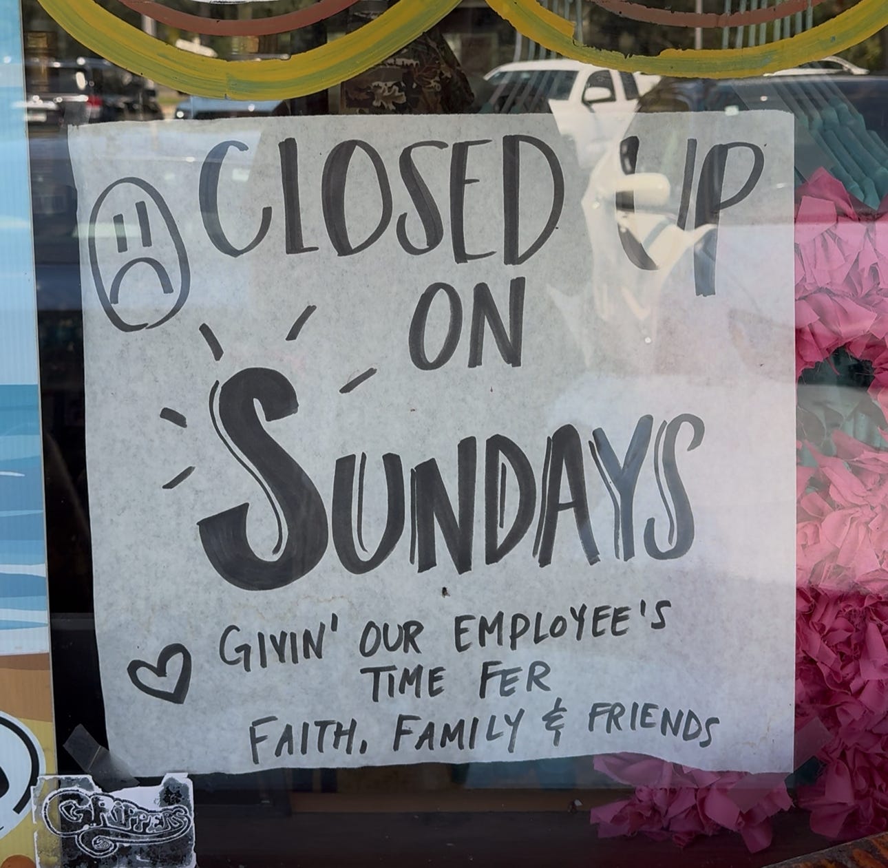 As we were walking up to the strip mall style building that Angie fully occupies, I couldn't help but smile at a sign in the window that read "Closed up on Sundays. Giving our employees time fer Faith, Family, and Friends."